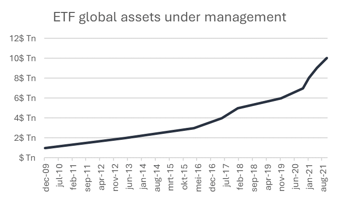Exchange traded funds (ETFs) have disrupted the investment industry providing millions of investors with an easy and affordable way to diversify their investment portfolios. The pooled investment security tracks indices, commodities, or other asset classes with the same conveniences as trading a stock. The ETF sector has rapidly expanded within a short timeframe. From December 2009 to November 2021, the industry grew from $1 trillion to $10 trillion.