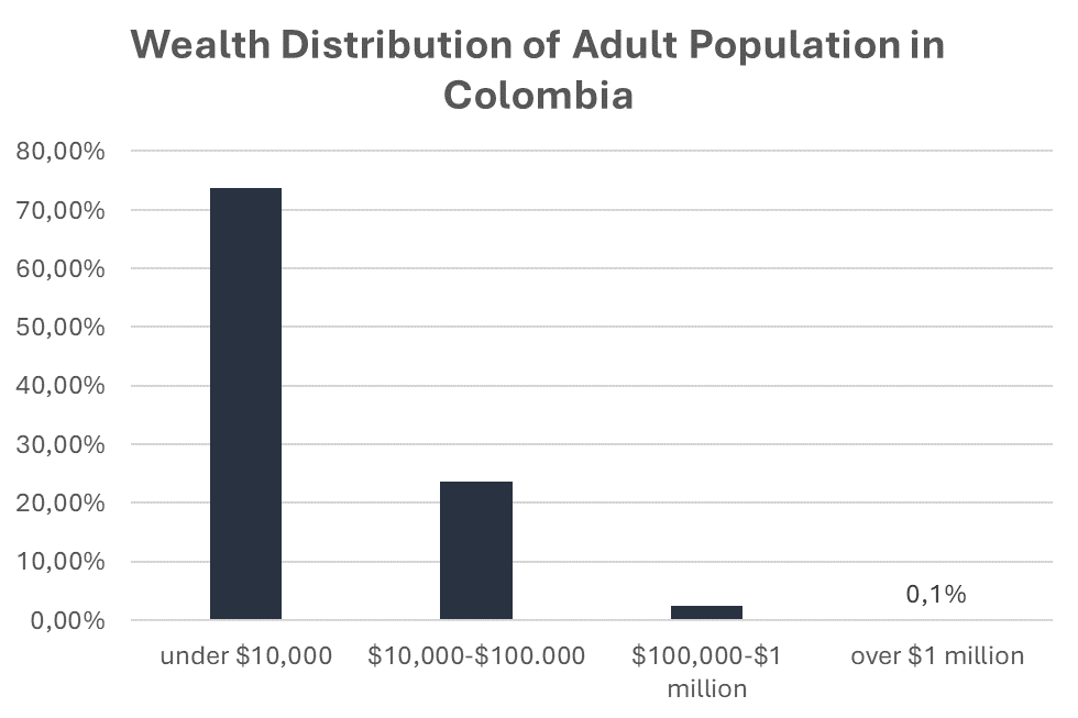 Colombian society is amongst the most unequal in the world with the top 10% having 73.1% of the nation’s wealth, meanwhile, the bottom half of the population retains a mere 1.6%. In 2022, the median wealth per adult was just $4,866, and only 2.6% of adults have a net worth of more than $100,000.