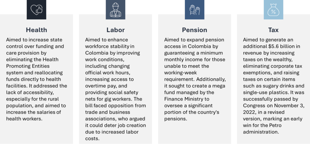 Besides the tax reform, Petro also aimed to reform in health, labor, and pensions to address the inequality in Colombia. All the reforms were proposed simultaneously in a tactic to push big reforms through early, before its bench could be weakened by the local elections in October 2023. Petro formed a strong alliances in government to ensure he had enough support in both chambers to pass his ambitious legislative agenda.