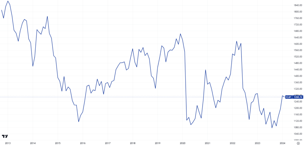 The downtrend in Colombian stocks ended after the opposition won the local elections in October 2023, which decreased the likelihood of further reform approvals by Congress. Since the August 2023 lows, the COLCAP has gained almost 18%.