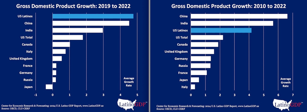 The U.S. Latino economy became the fastest-growing in the world after China’s prolonged COVID lockdowns. Between 2019 and 2022, it expanded at an impressive real average annual growth rate of 4.8%—2.6 times faster than the overall U.S. economy. Only India poses a potential challenge to U.S. Latinos’ rise to becoming the world’s third-largest economy.